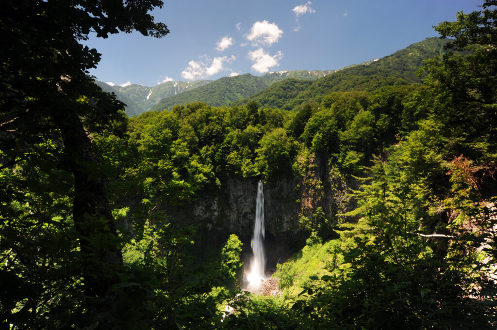 The surrounding forest is covered with broadleaf woodland dominated by Japanese beech and mizunara oak, providing a changing seasonal backdrop that enhances the falls—fresh green in spring, deep green in summer, vivid autumn foliage, and snow-covered scenery in winter. In the distance rise the peaks of the southern Hakusan ridgeline, allowing visitors to view the waterfall against the dramatic backdrop of the Hakusan mountain range.