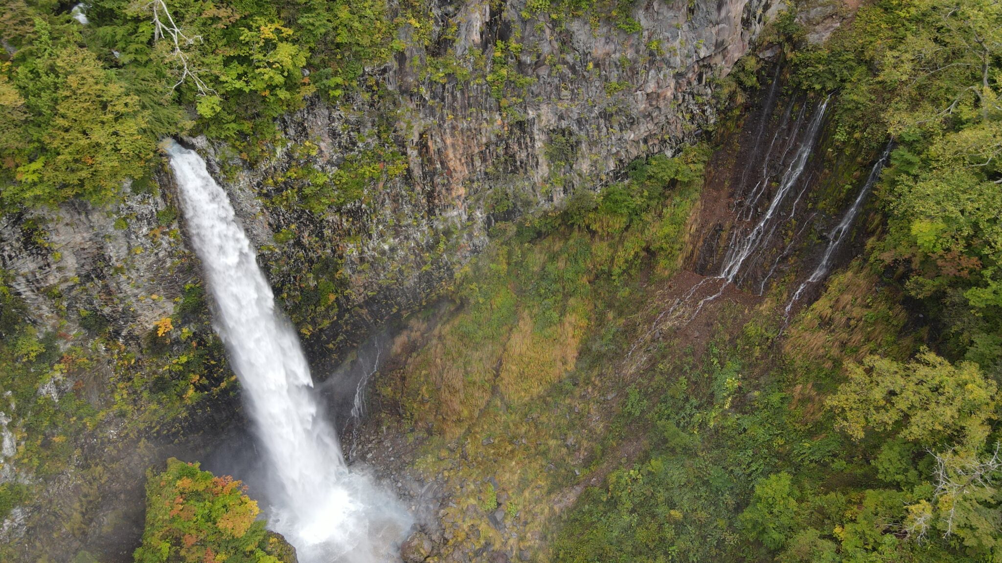 At the base of the falls spreads an emerald-green pool characteristic of the Oshirakawa area, creating a fantastical contrast with the white spray of the falling water. The surrounding cliffs clearly display columnar joints formed as lava cooled and solidified, preserving visible traces of the eruption 2,200 years ago. The differing orientations of these joints on either side of the falls make the site particularly valuable from a geological perspective.
