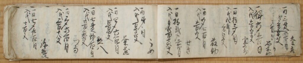 写真の遠山家所蔵の「心外物覚帳」は、嘉永4年(1851年)から明治24年(1891年)までの40年間にわたり、遠山家の家長が家族員から買い取ったシンガイ物を記録したものです。シンガイ物とは家族員がシンガイ日(休み日)などを利用して生産した私物のことで、遠山家のこの帳面には「稗・大豆・米・栗・蕎麦・桑の葉」などが売渡されたことが記載されています。このシンガイ稼ぎは子供と家長以外のほぼ全員が従事していました。
