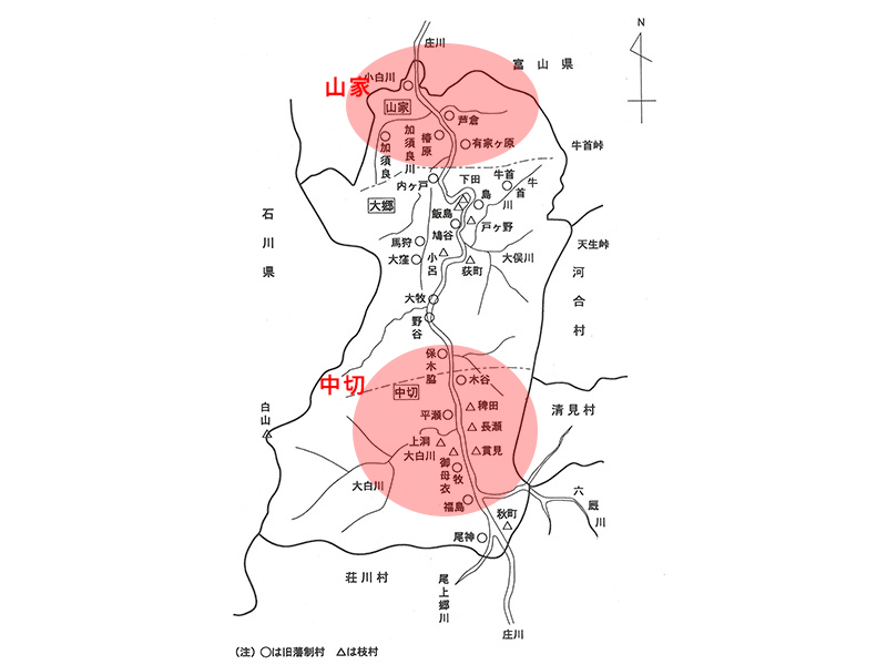 一つの家の家族員数が多い「大家族」制はとりわけ白川村南部の「中切地区」と北部の「山家地区」に集中してみられました。明治期に入りその特徴は顕著になり、国の重要文化財となっている遠山家では一番多い時(明治30年代)には45人程の人々が一緒に生活していました。