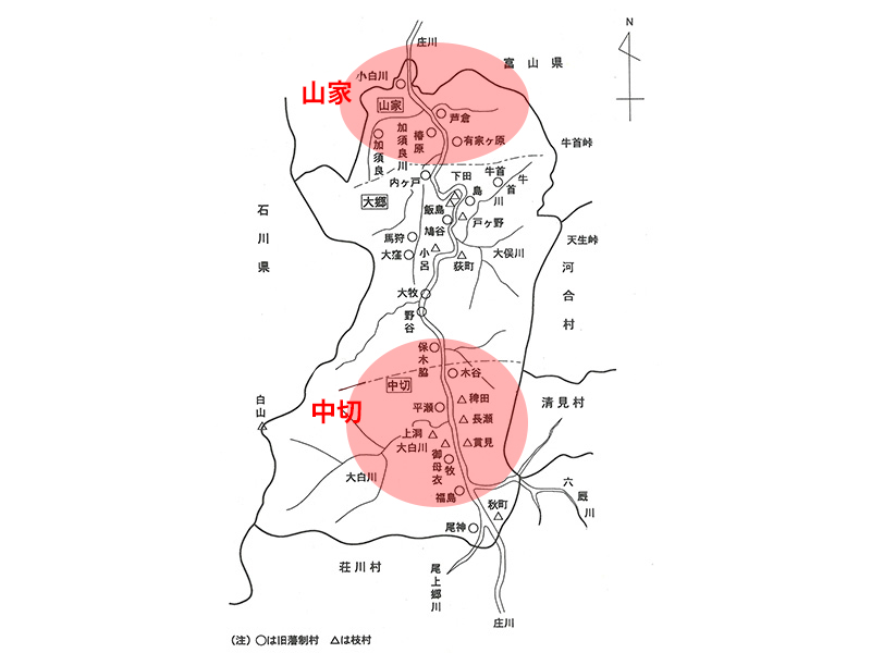 一个家庭的家族成员众多的“大家族制度”,尤其集中见于白川村南部的“中切地区”和北部的“山家地区”。进入明治时期后,这一特征愈发显著,成为国家重要文化财的远山家,在人数最多的时候(明治30年代),约有45人一同生活。