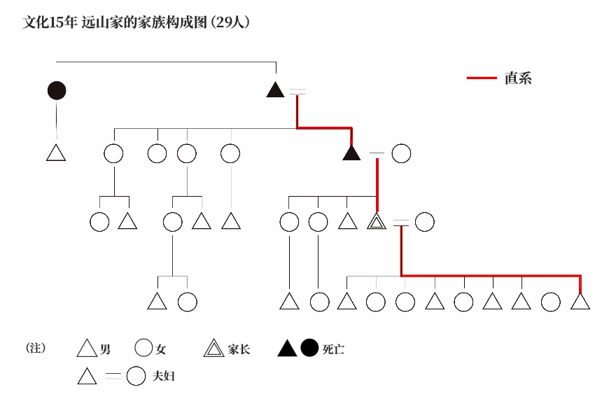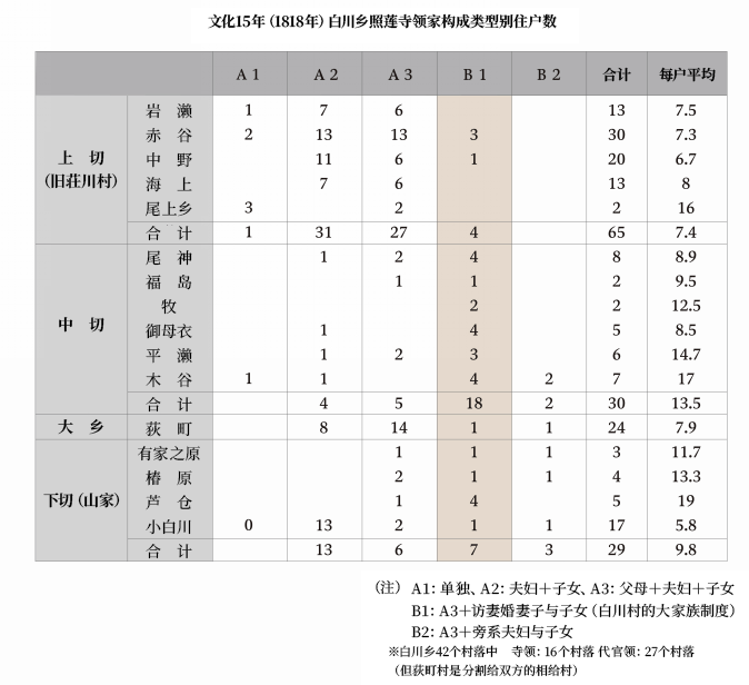 他详细研究了白川村中切地区六个聚落的家族构成,注意到白川村大家族的构成不仅平均每户家族成员数量多,而且在与户主的关系上也包含着复杂的构成。