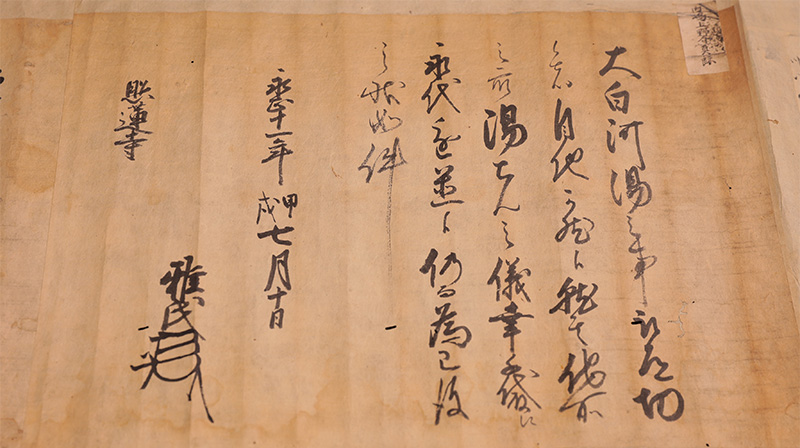 归云城主内岛雅氏寄给照莲寺的书信。文中可见“大白河汤之事”的记述。