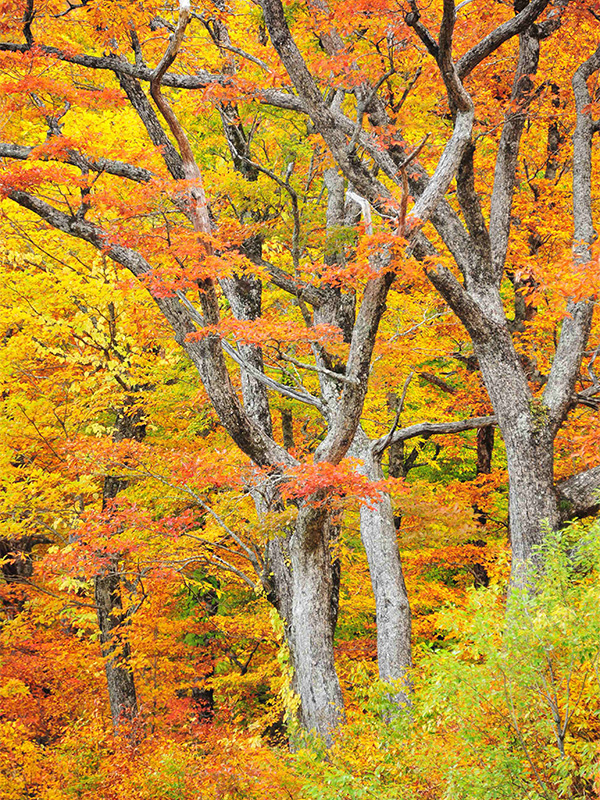 日本是一个“森林大国”,约三分之二的国土被森林覆盖。其中,由自然力量形成的天然林在各区域展现多样风貌,大白川周边即为典型代表。在海拔约1,600米以下,以山毛榉为主的冷温带落叶阔叶林广泛分布,夏季郁郁葱葱、秋季层林尽染、冬季银装素裹,四季景致丰富多彩。