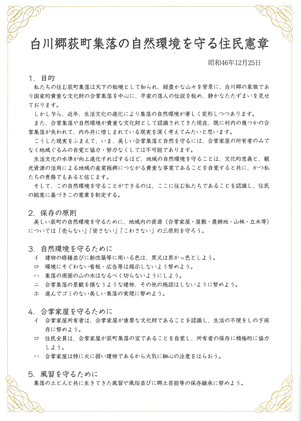 於是,在昭和46年12月25日(1971年12月25日),終於制定了「白川鄉荻町聚落自然環境守護居民憲章」,並成立了居民保存會「白川鄉荻町聚落自然環境守護會」,通稱「守護會」。居民憲章以「不賣」「不租」「不破壞」合掌造及其周邊自然環境作為保存三原則,並在宗旨中與村民共享了「透過活用觀光資源以振興地區產業」這一明確的未來願景。荻町居民持續恪守這部憲章的理念,半世紀以來一直致力於合掌造聚落景觀的保存工作。
