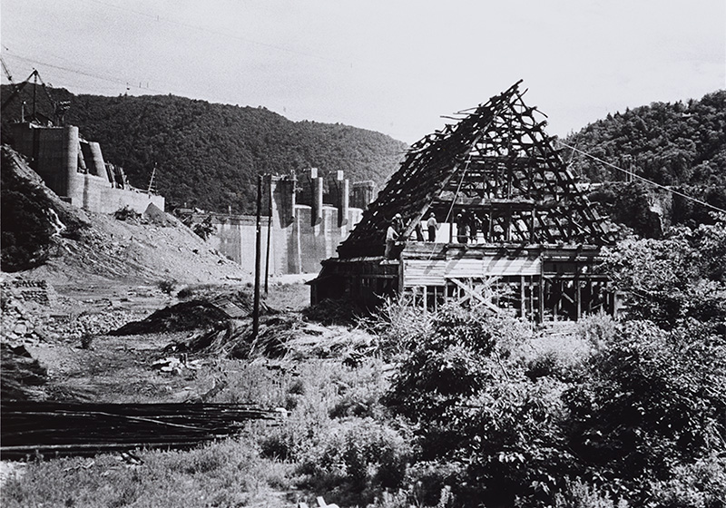 開園當時的合掌村。村民全員出動參與修筑石頭地基作業。