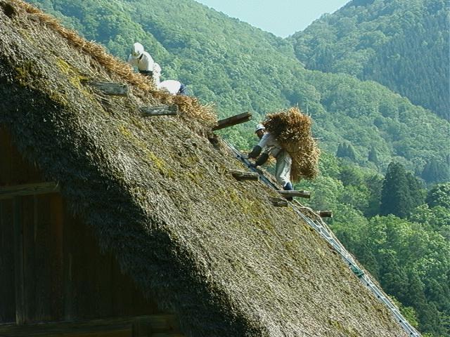 合掌造每年初春都要更換屋頂茅草,財團會支援相關費用。